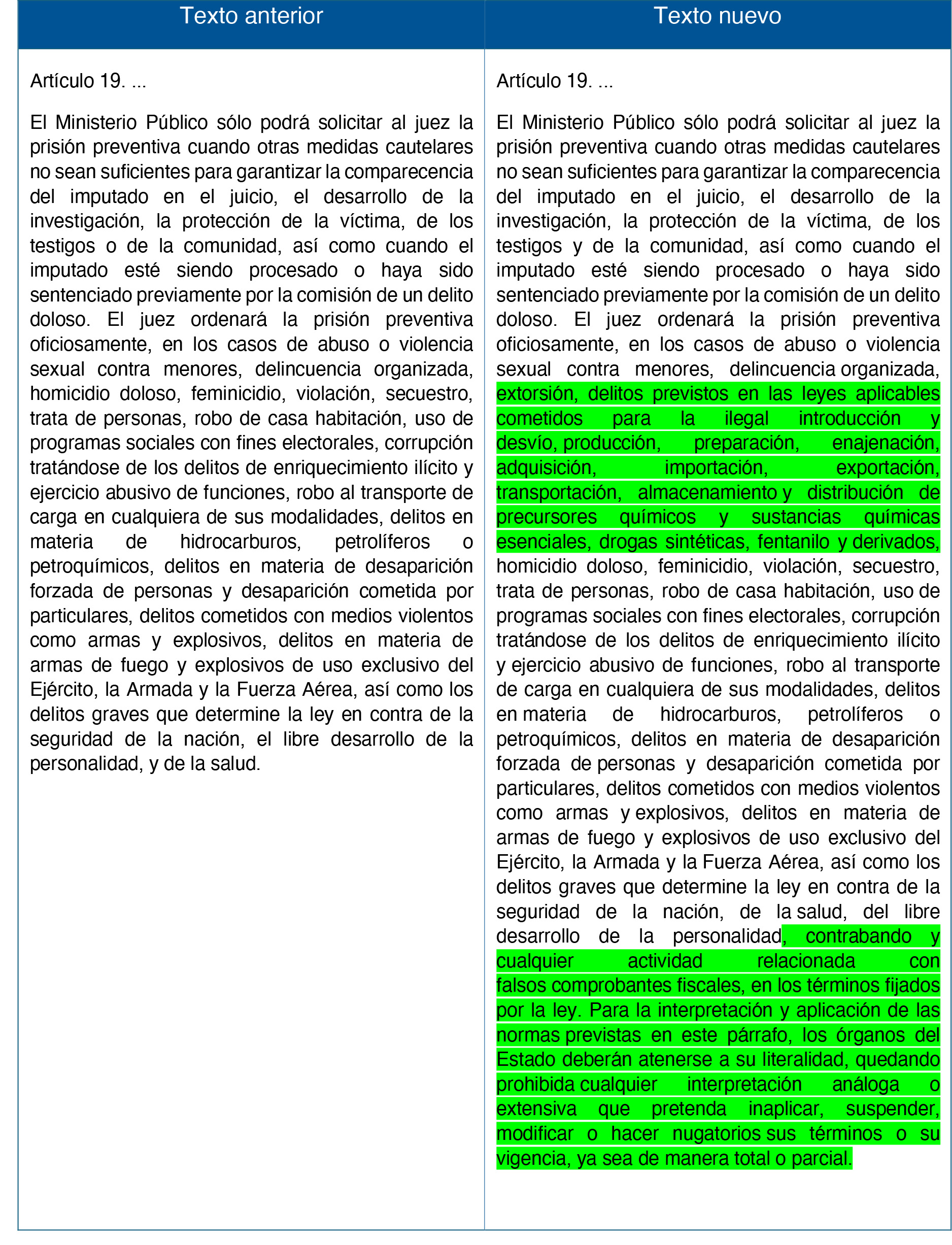 Al respecto, el 31 de diciembre de 2024, en la edición vespertina del Diario Oficial de la Federación, la Secretaría de Gobernación dio a conocer el DECRETO por el que se reforma el párrafo segundo del artículo 19 de la Constitución Política de los Estados Unidos Mexicanos, en materia de prisión preventiva oficiosa. Con dicha modificación se adicionan los siguientes casos en los cuales el juez ordenará la prisión preventiva oficiosamente:
